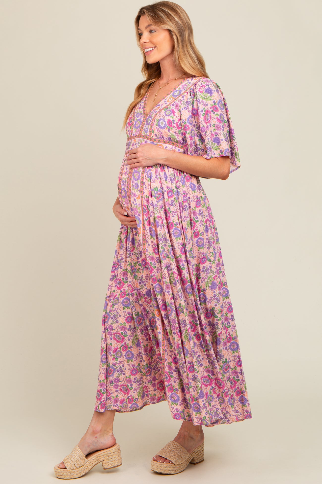 Light Pink Floral Border Print Flutter Sleeve Maternity Maxi Dress