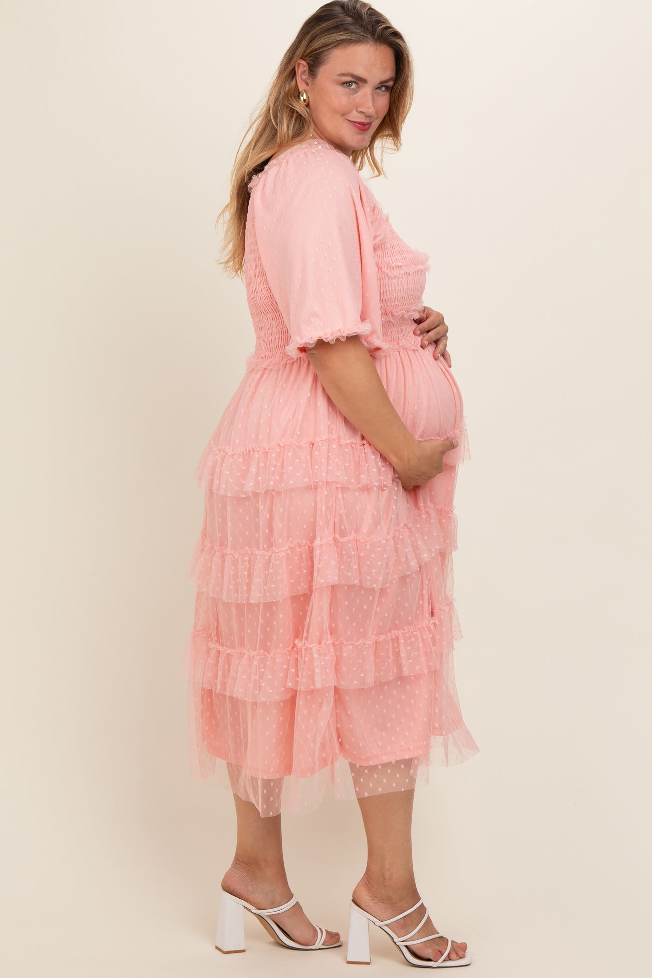 Light Pink Swiss Dot Smocked Tiered Maternity Plus Midi Dress