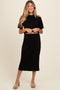 Details A solid maternity fitted midi dress with a deep v-neckline with wrap detail and side slit. Content + Care