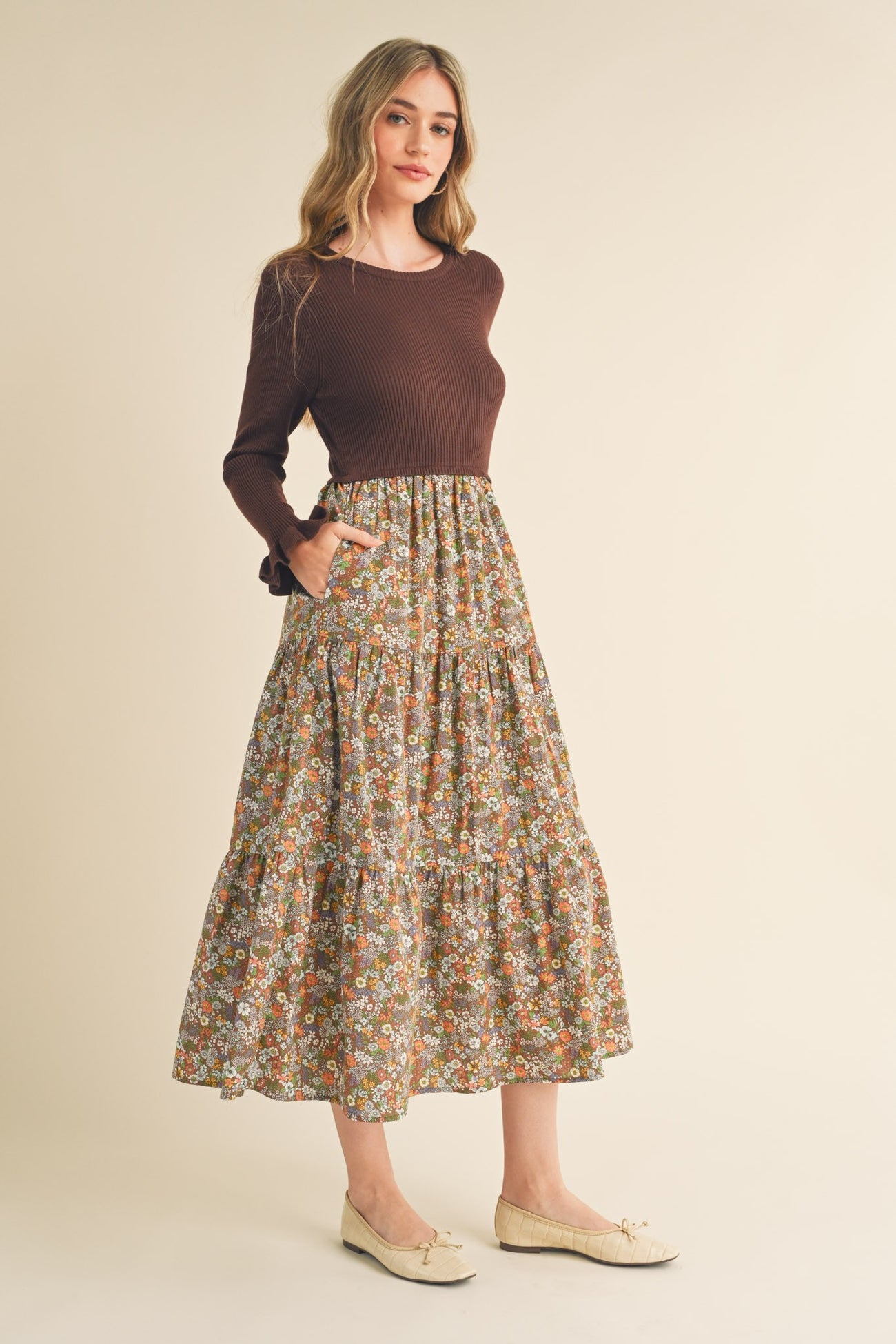 Mocha Floral Knit Midi Dress With Contrast Woven Skirt