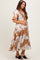 Embrace your glow with the Mocha Floral Smocked Front Tie Cutout Maternity Maxi Dress. This beautiful midi dress features a warm mocha base adorned with large white floral prints perfect for any season. The smocked bodice offers gentle stretch to comfortably accommodate your growing bump, while the front tie and subtle cutout add a stylish, feminine touch. Puff sleeves and a tiered skirt create a flattering silhouette that flows effortlessly. Made from soft, breathable fabric, it’s ideal for everyday wear or special occasions. Elevate your maternity wardrobe with comfort and chic charm!