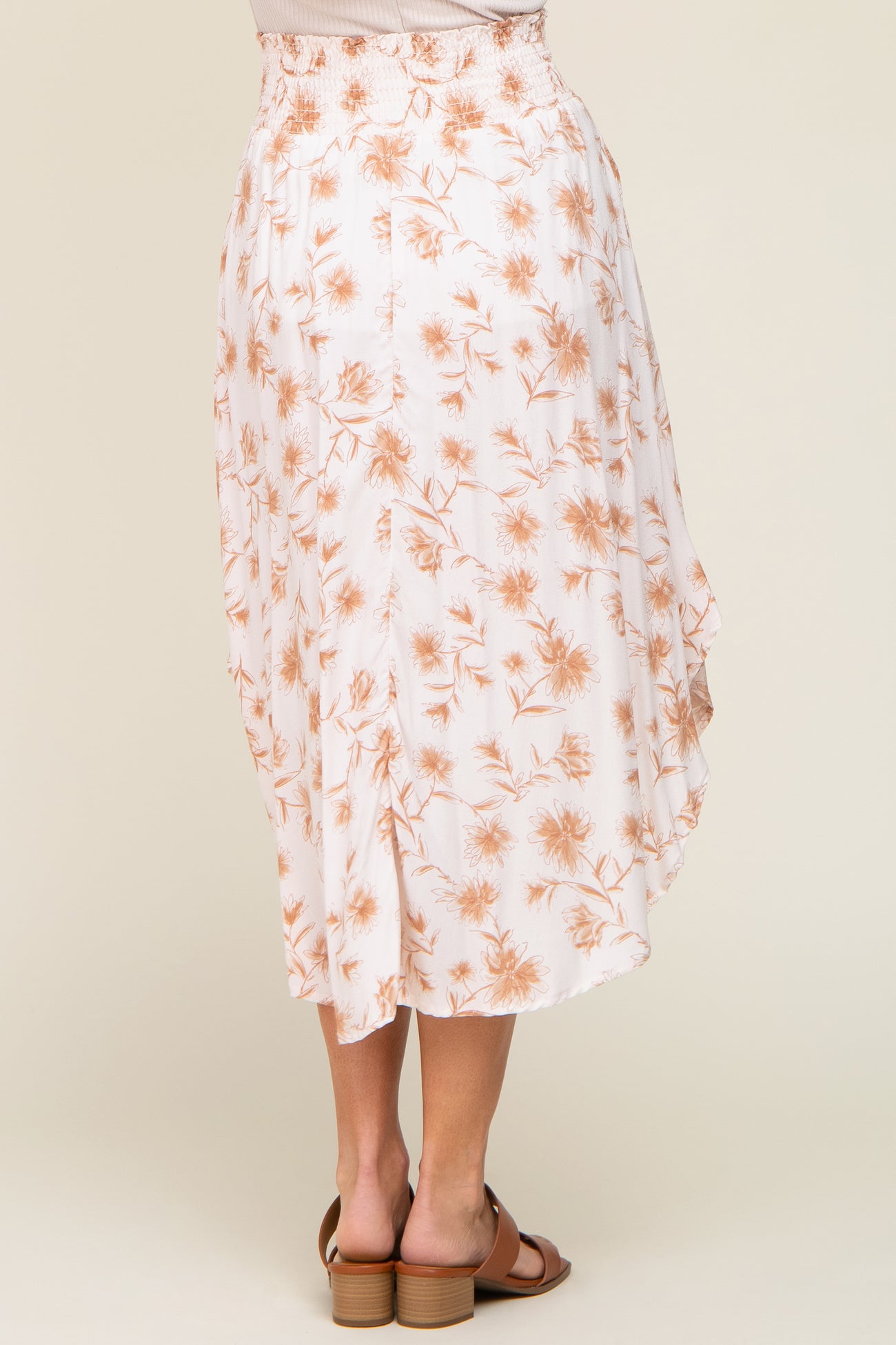 Mocha Floral Smocked Waist Round Hem Midi Skirt