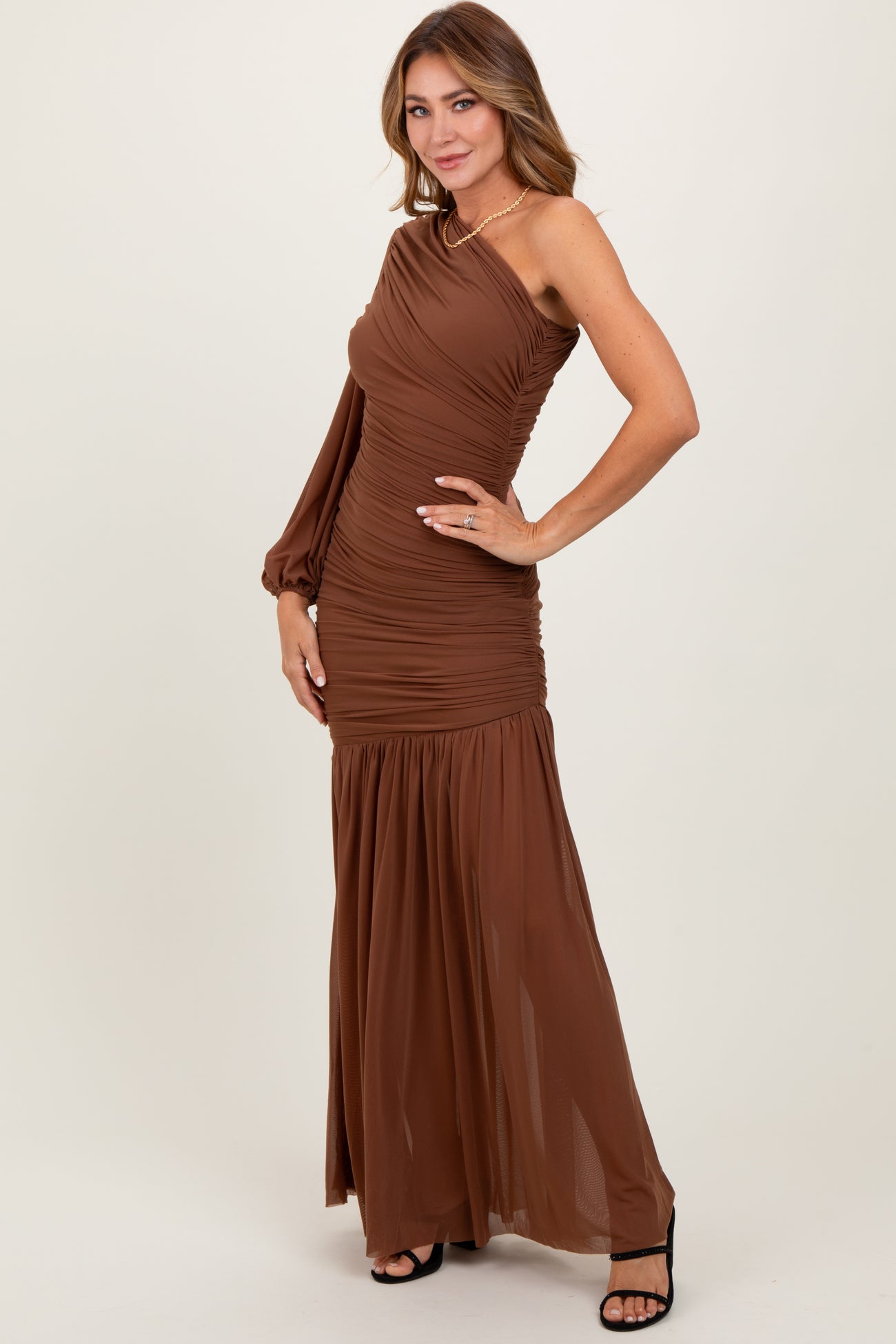 Mocha Ruched Mesh One Shoulder Asymmetric Maxi Dress
