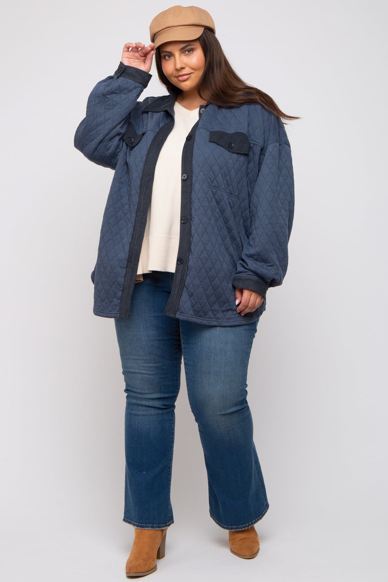 Navy Blue Colorblock Quilted Maternity Plus Shirt Jacket