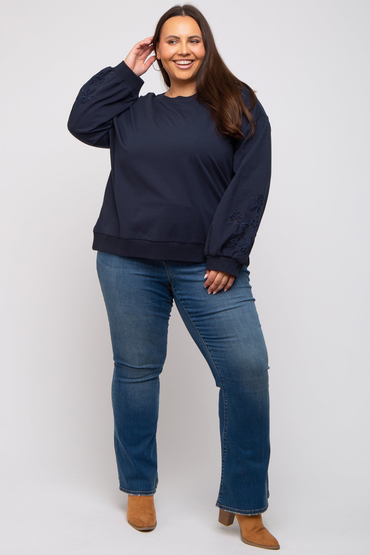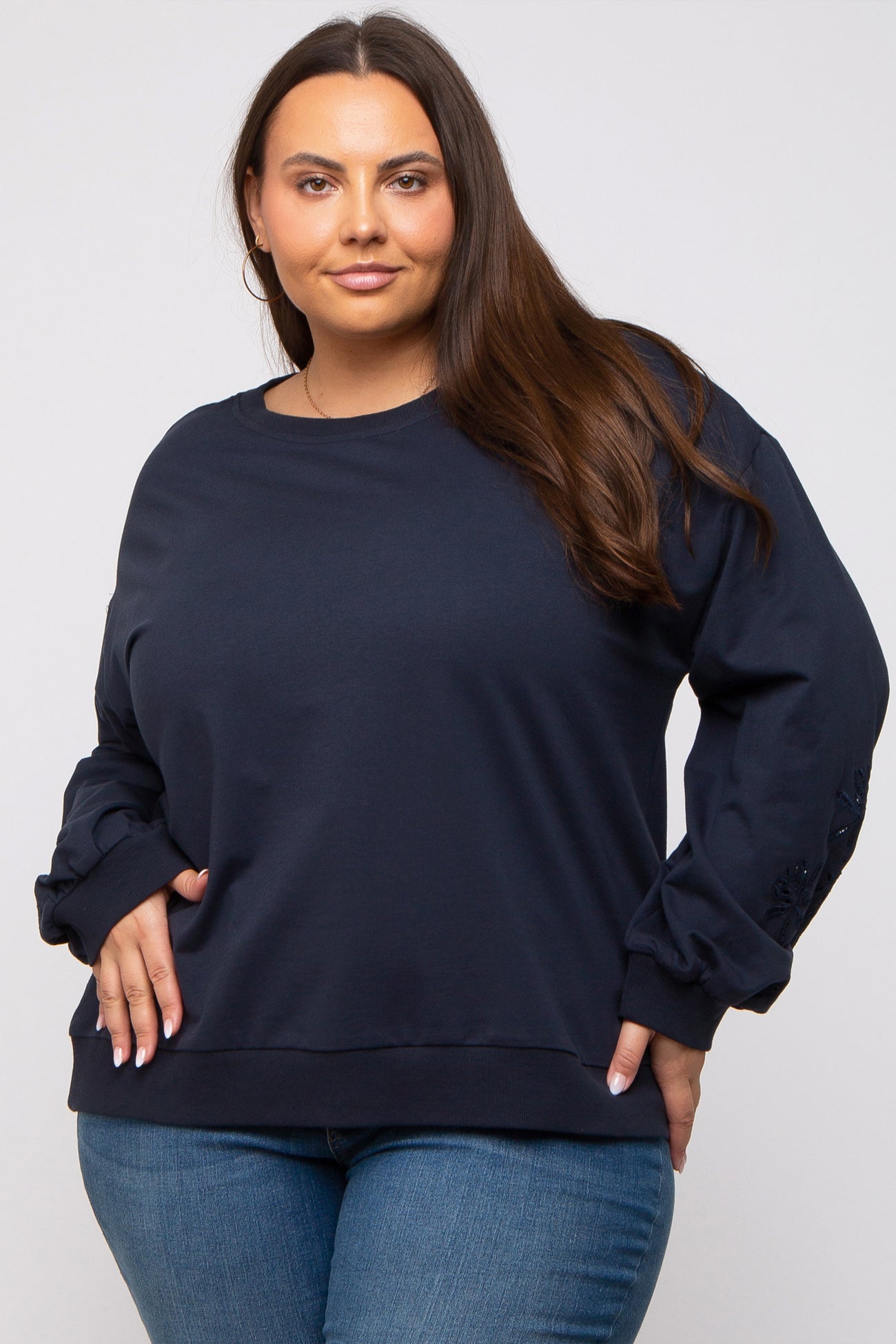 Details A solid hued plus top featuring long sleeves with embroidered details and a rounded neckline. Content + Care
