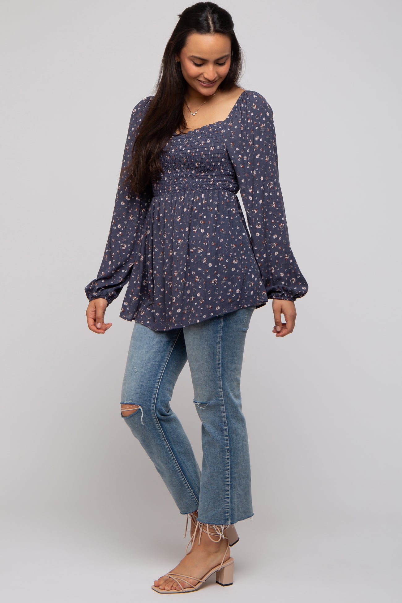 Details A floral print top featuring a smocked bust, long sleeves and a square neckline. Content + Care