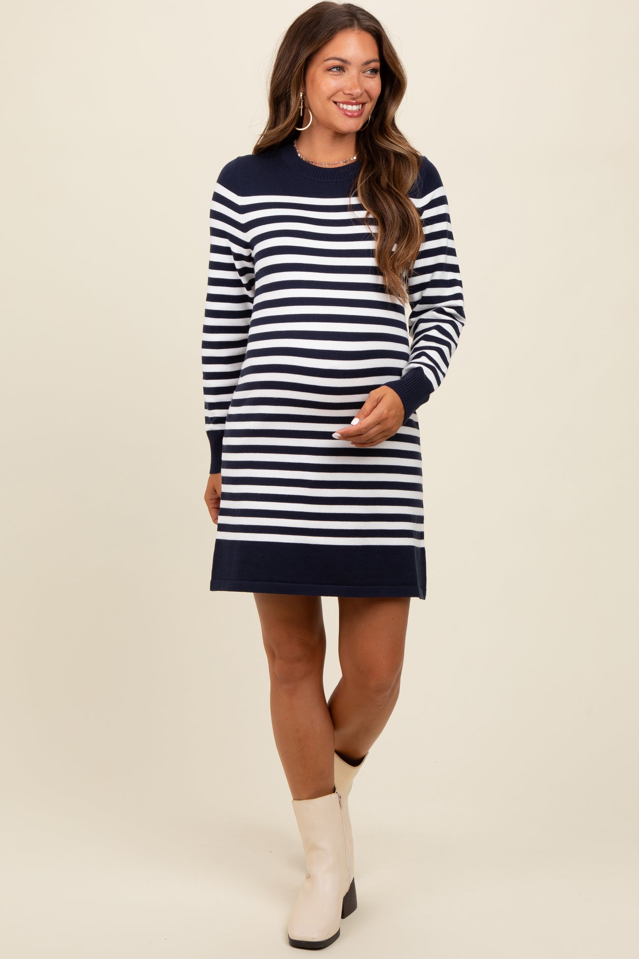 Navy Striped Long Sleeve Knit Maternity Mini Dress