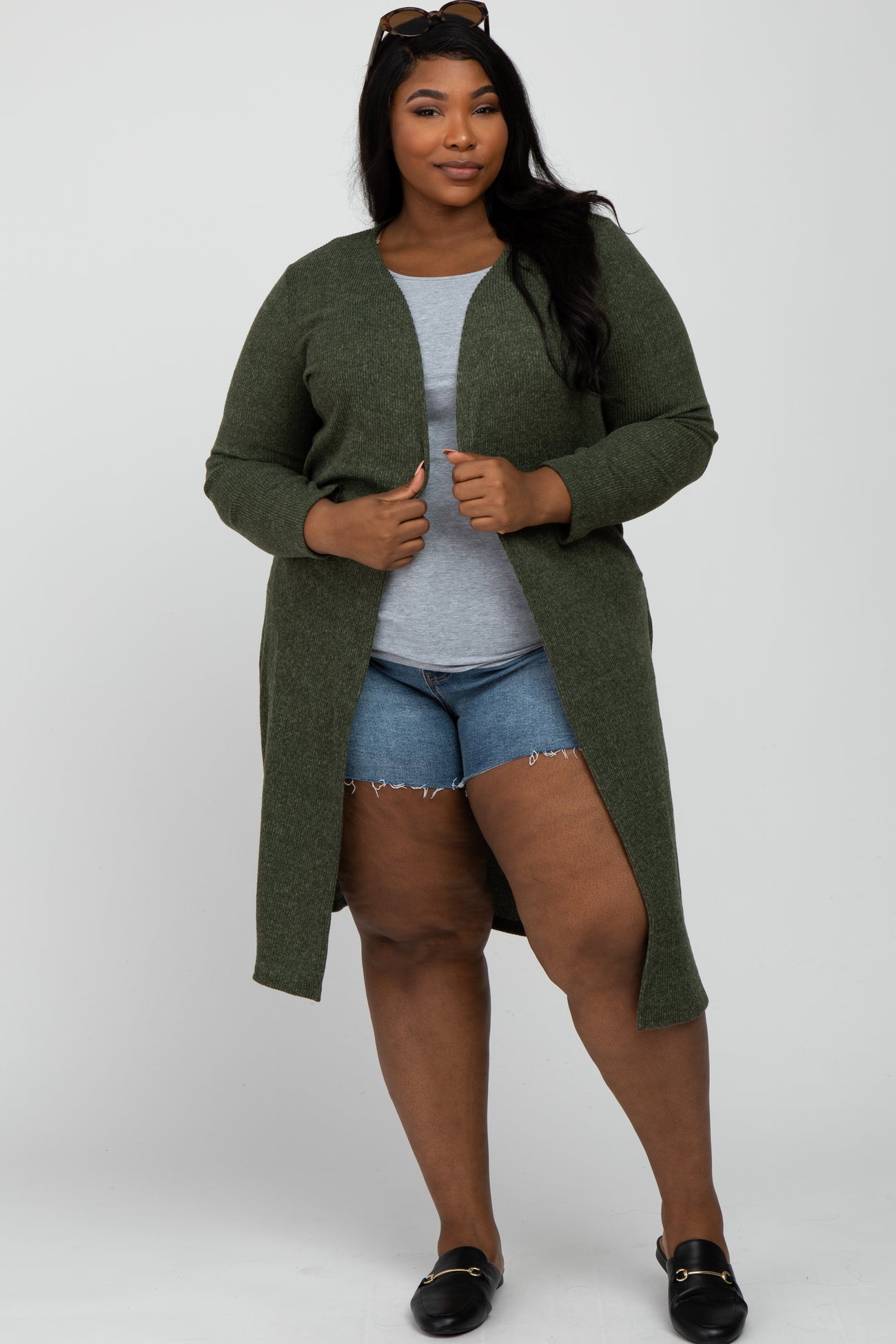 Olive Heathered Ribbed Side Slit Long Plus Cardigan