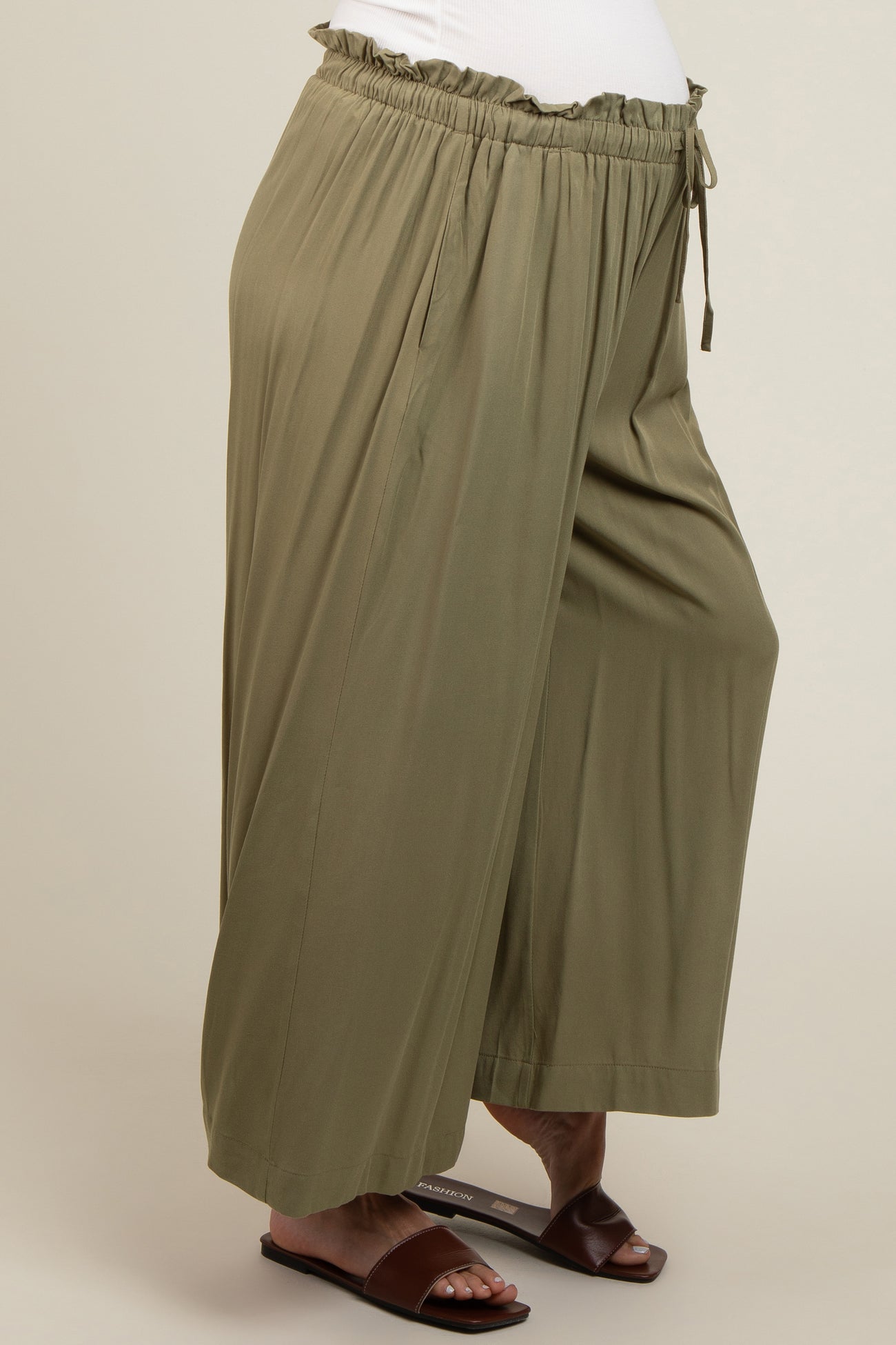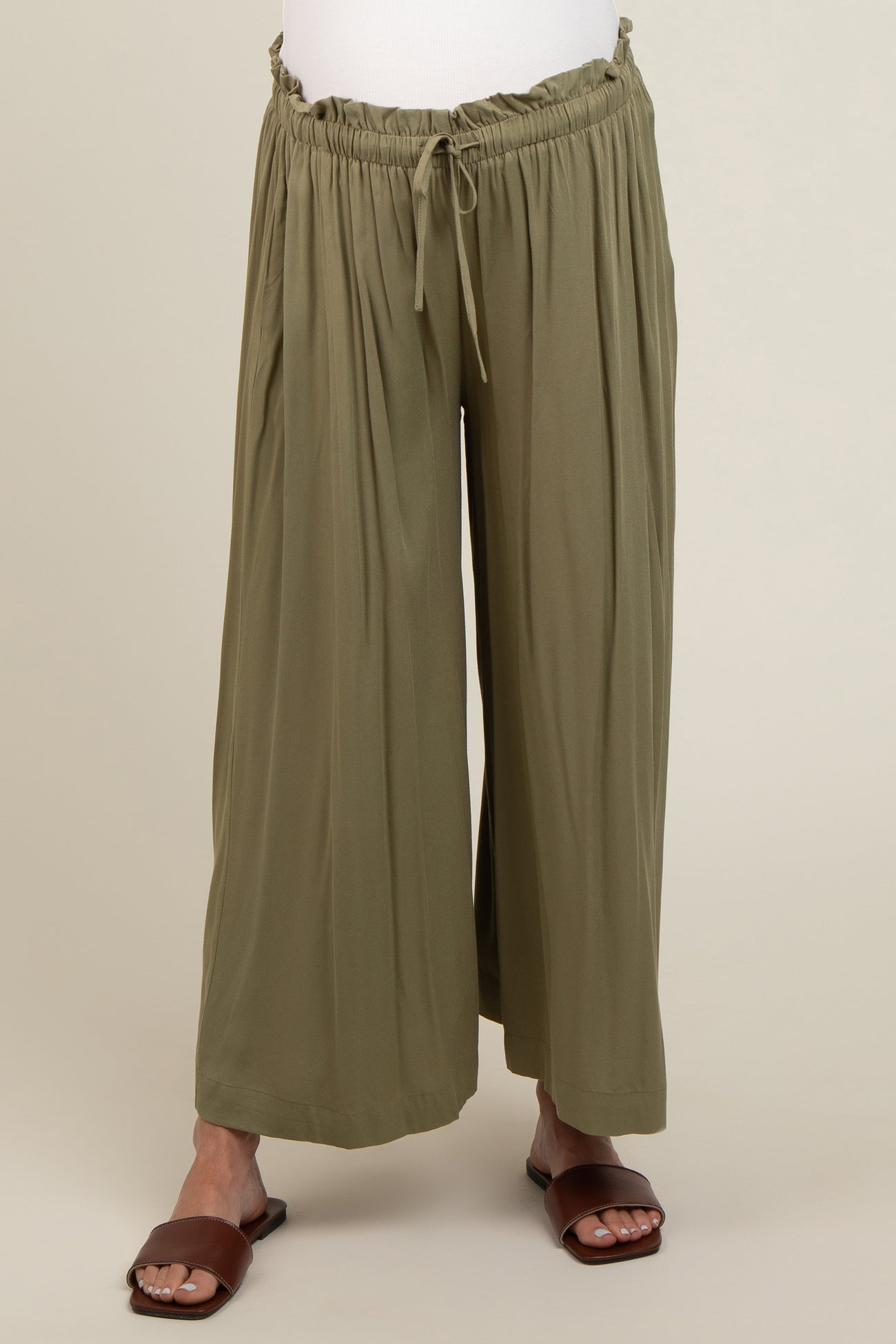 Olive Pleated Elastic Waist Wide Leg Crop Maternity Pants