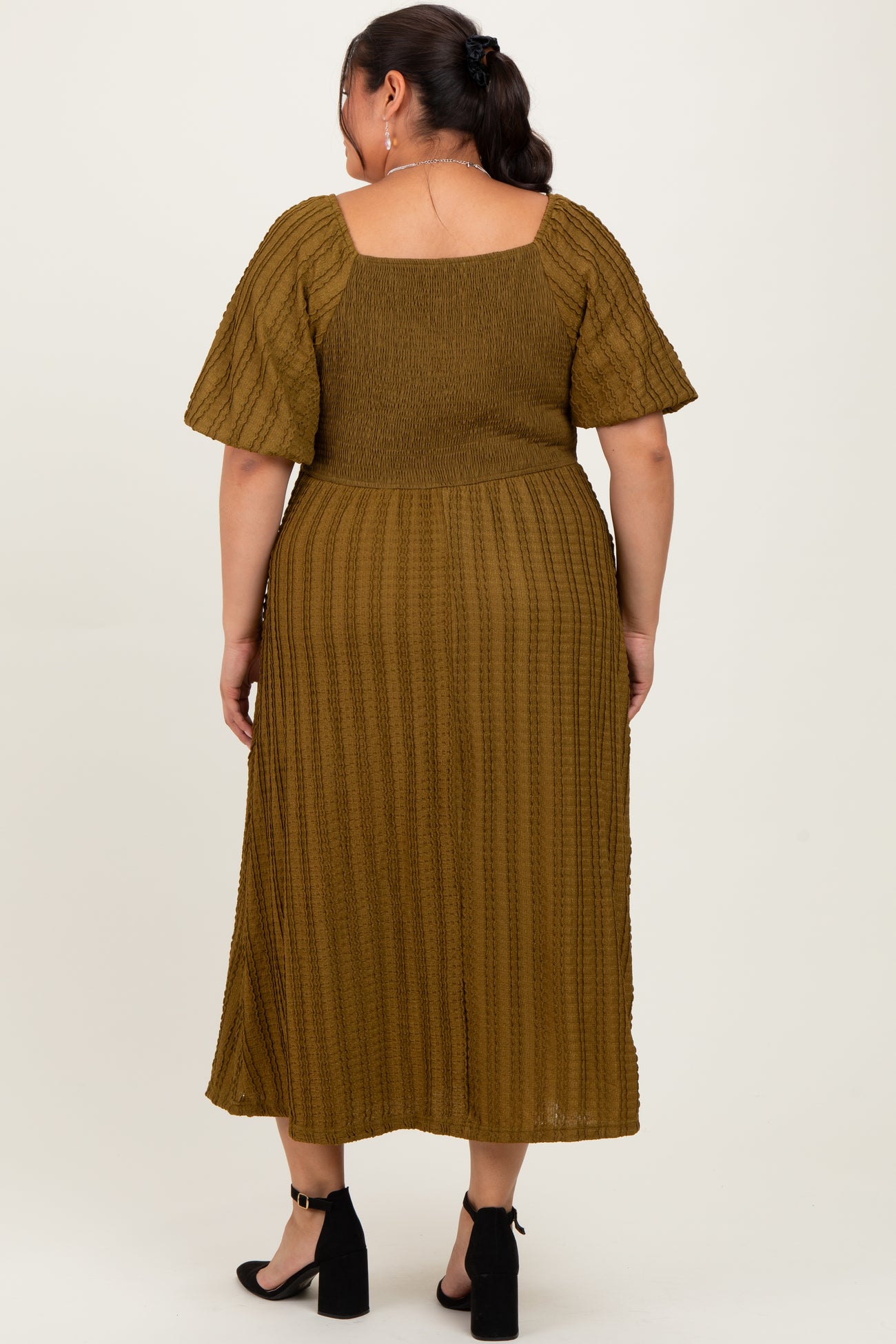 Olive Smocked V-Neck Short Puff Sleeve Textured Plus Midi Dress