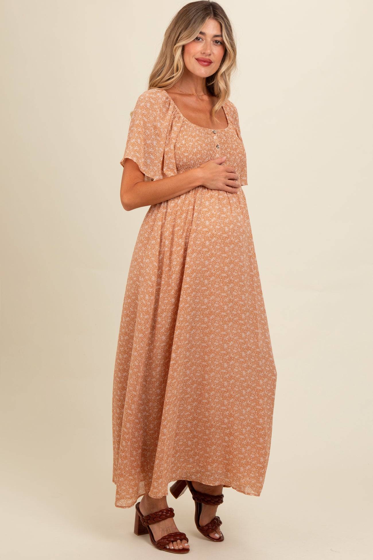 Peach Floral Smocked Button Accent Maternity Maxi Dress