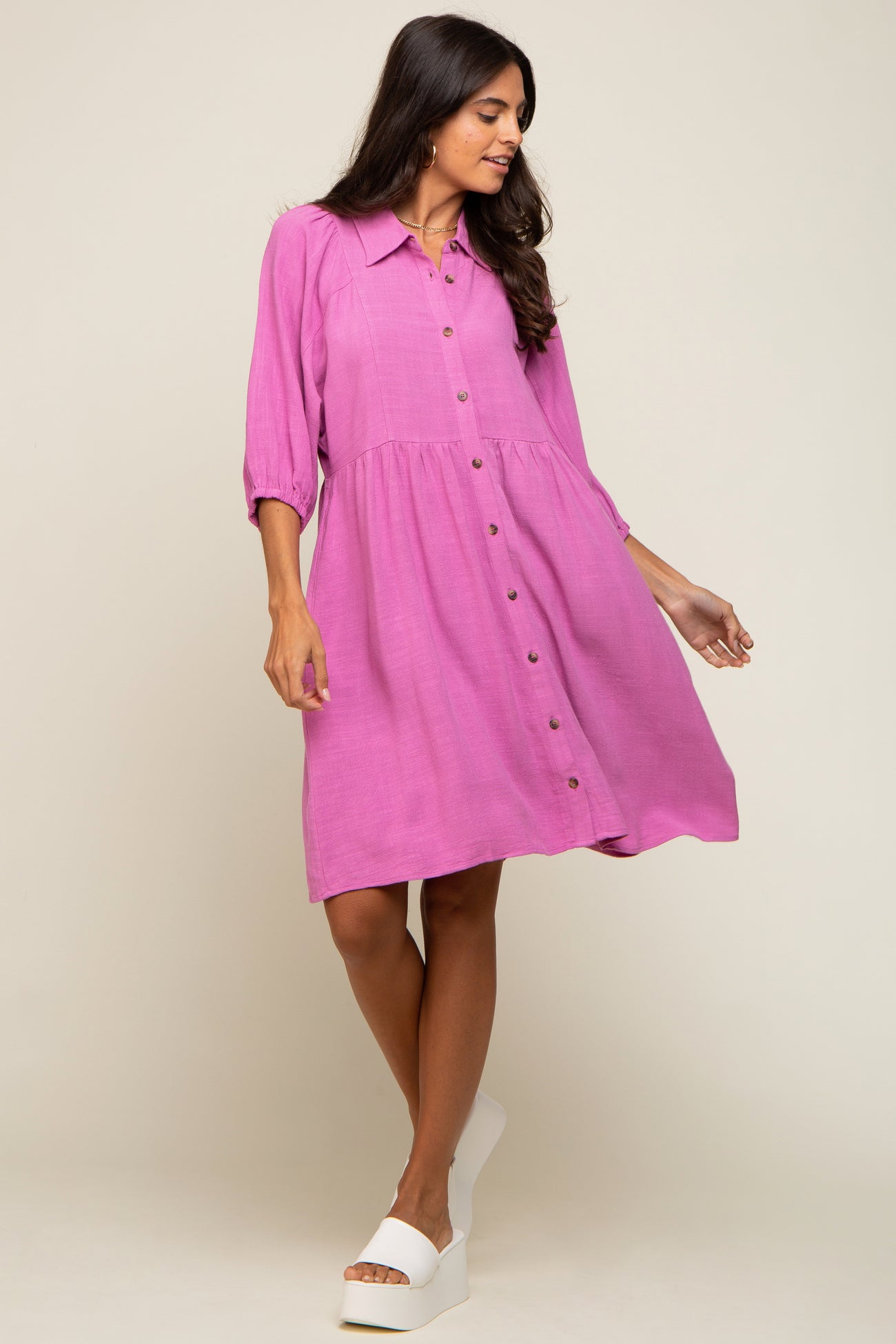 Details A solid hued dress featuring a button down front, a collared neckline, side pockets and 3/4 sleeves. Content + Care