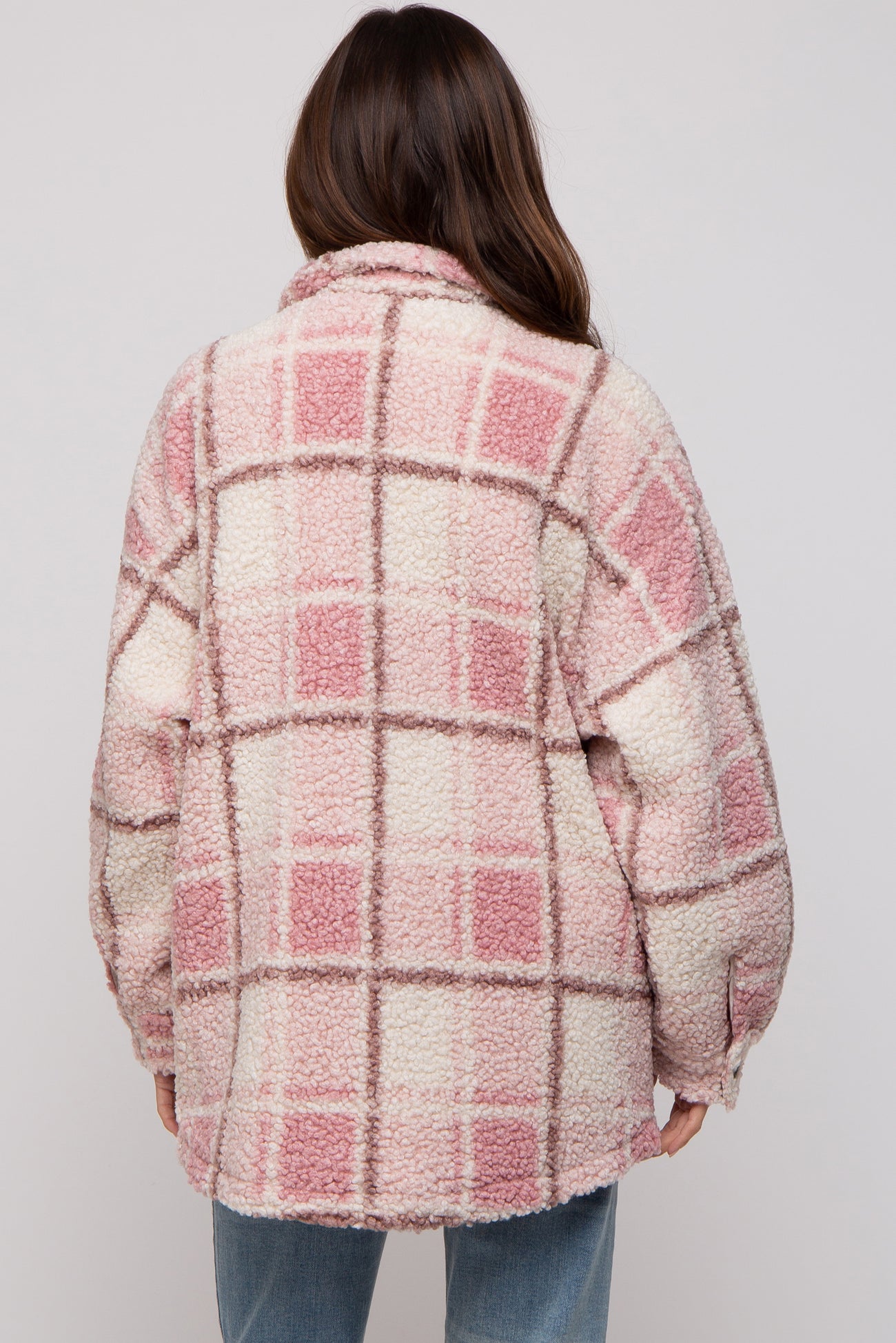 Details A plaid print maternity sherpa jacket featuring a collared neckline, two front pockets, a button down front, long sleeves and inner lining. Content + Care
