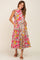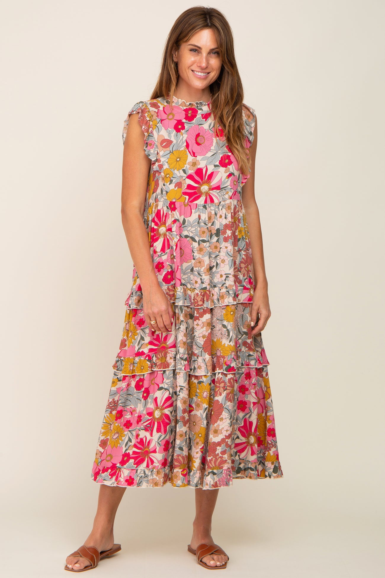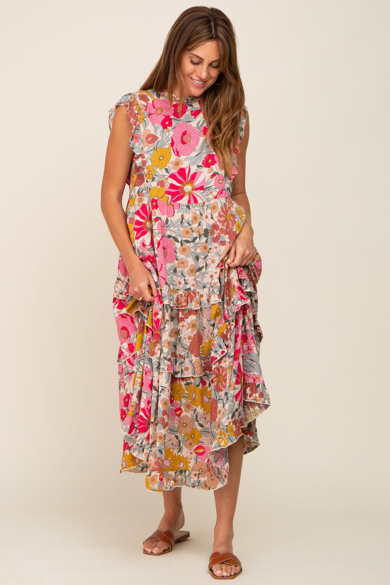 Pink Retro Floral Ruffle Tiered Midi Dress
