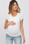 A striped peplum maternity top featuring a low back with a cross accent, short sleeves, and a rounded neckline.