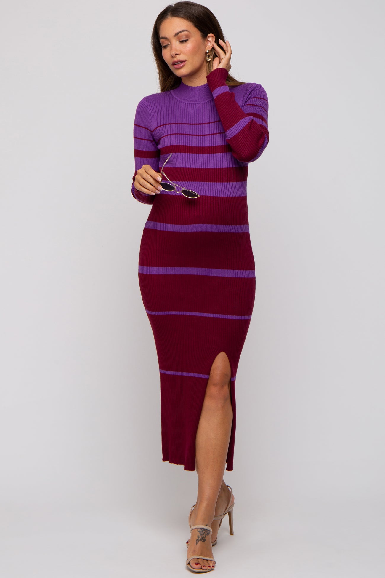 A rib knit maternity midi dress featuring a mock neckline, long sleeves, and a side slit.