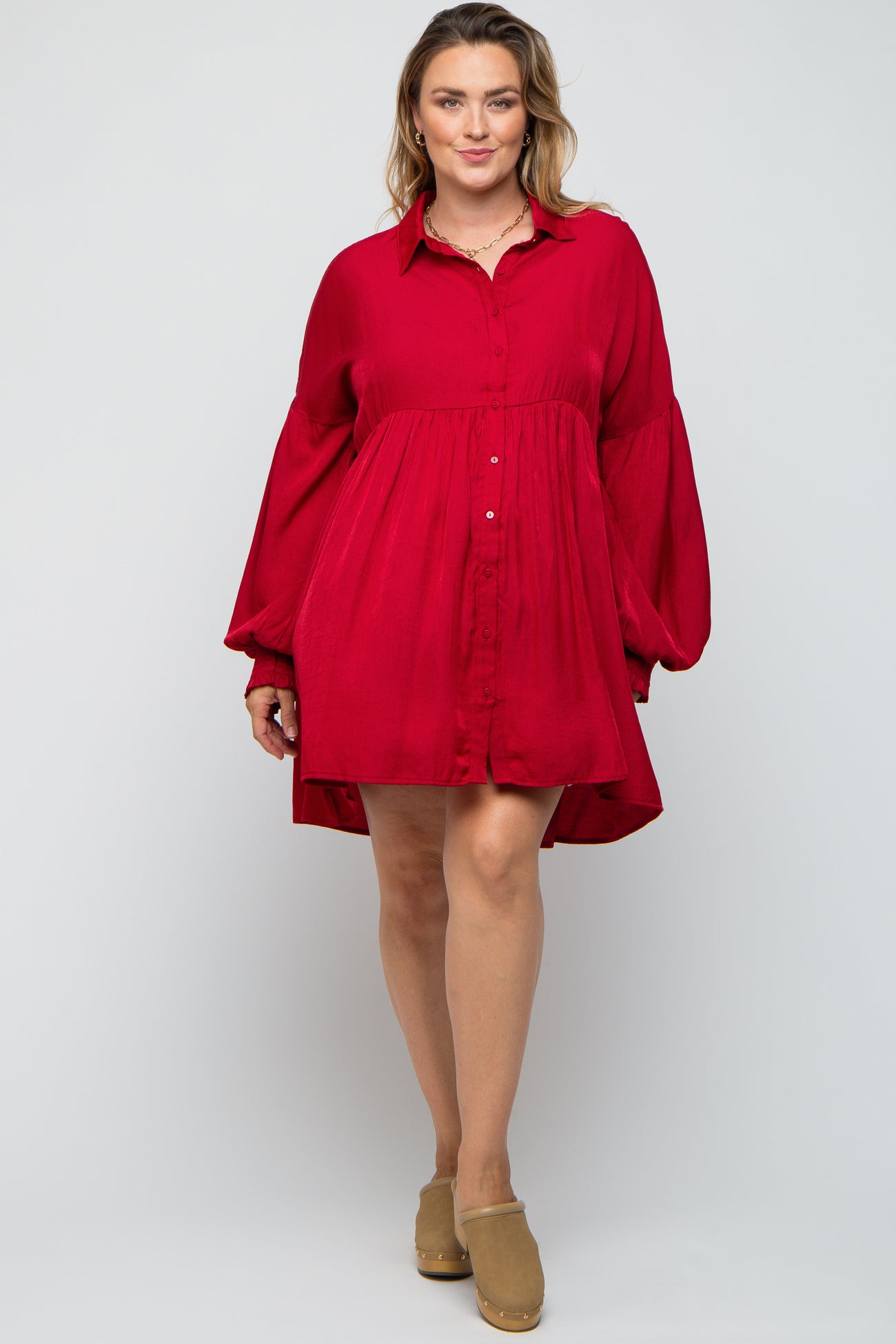 A solid maternity plus dress with a collared neckline, button down front and smocking on sleeves.