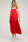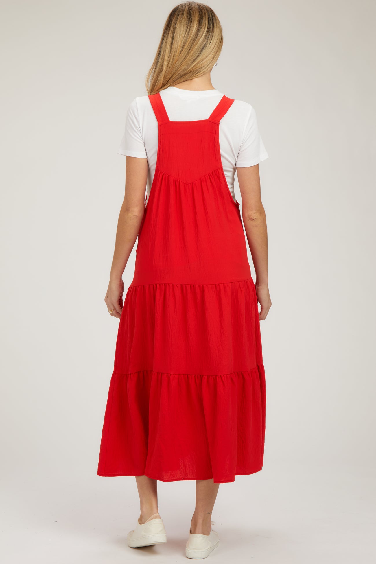 A solid hued maternity dress featuring button sling straps, a front pocket, side pockets and a tiered skirt.