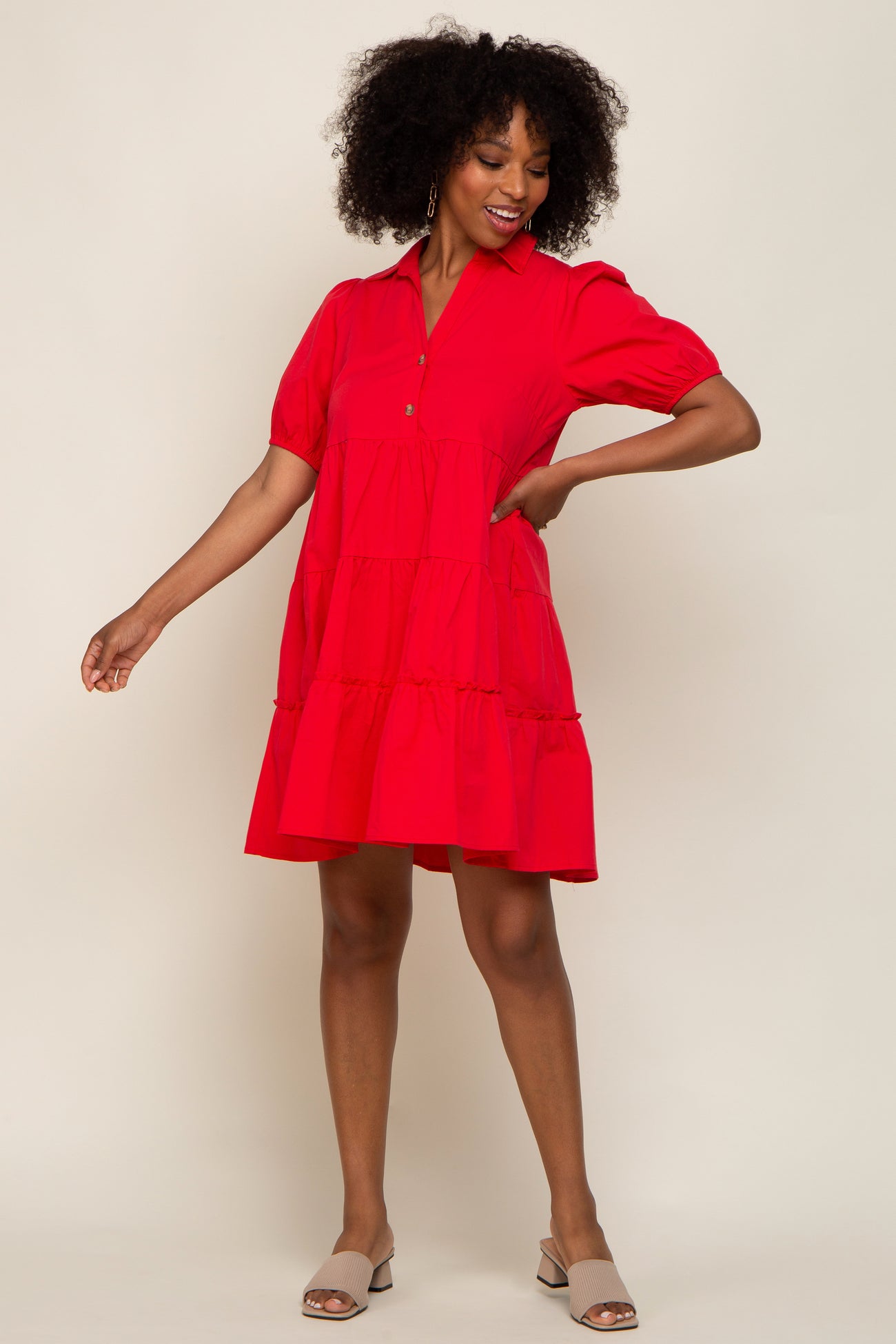 Details A solid dress featuring front buttons, a collared neckline, side pockets, a tiered skirt and short sleeves. Content + Care
