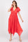 Red Deep V-Neck Puff Short Sleeve Asymmetrical Hem Midi Dress