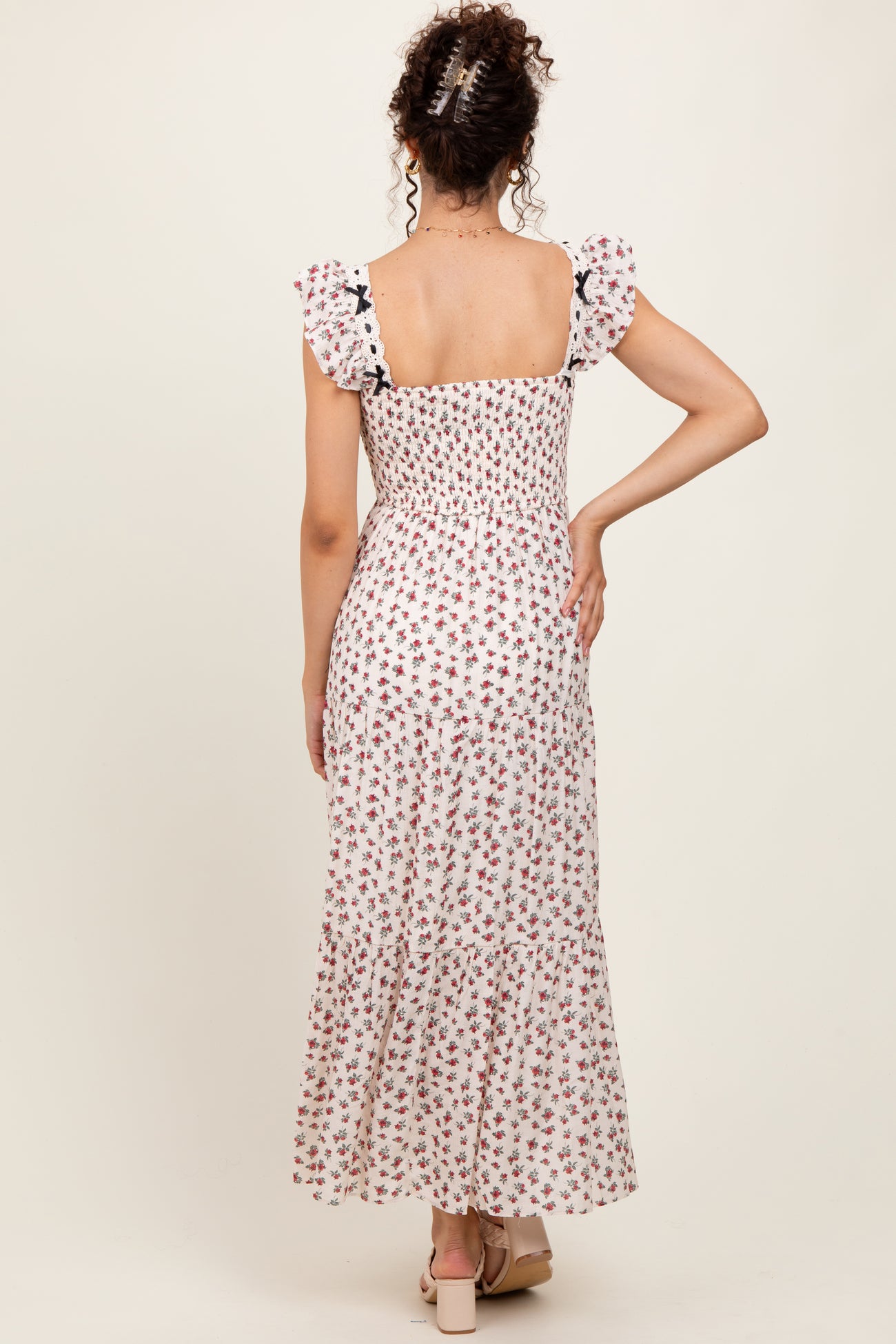 Red Floral Bow Trim Lace Detail Smocked Maxi Dress