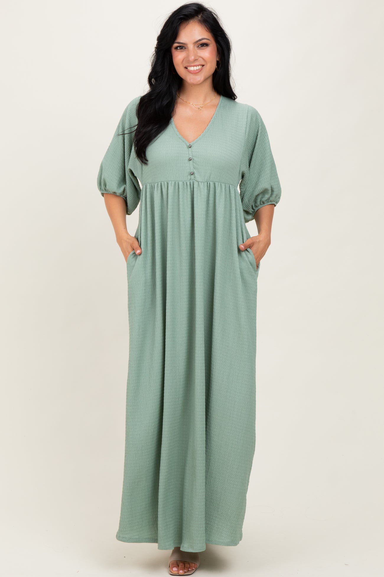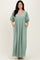 Sage Solid Woven 3/4 Sleeve V-Neck Button Down Maxi Dress