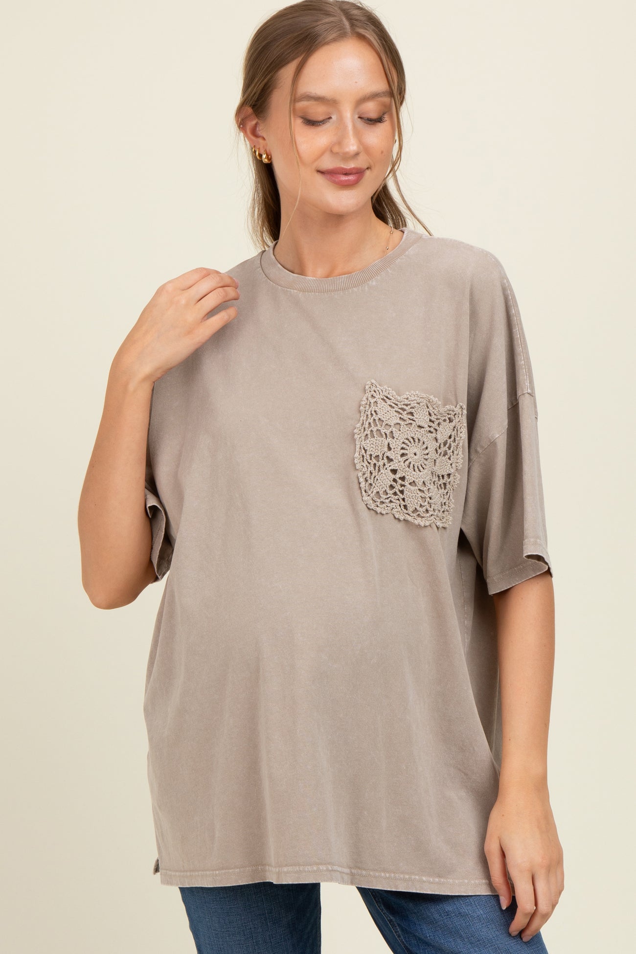 Taupe Mineral Wash Crochet Pocket Maternity Top