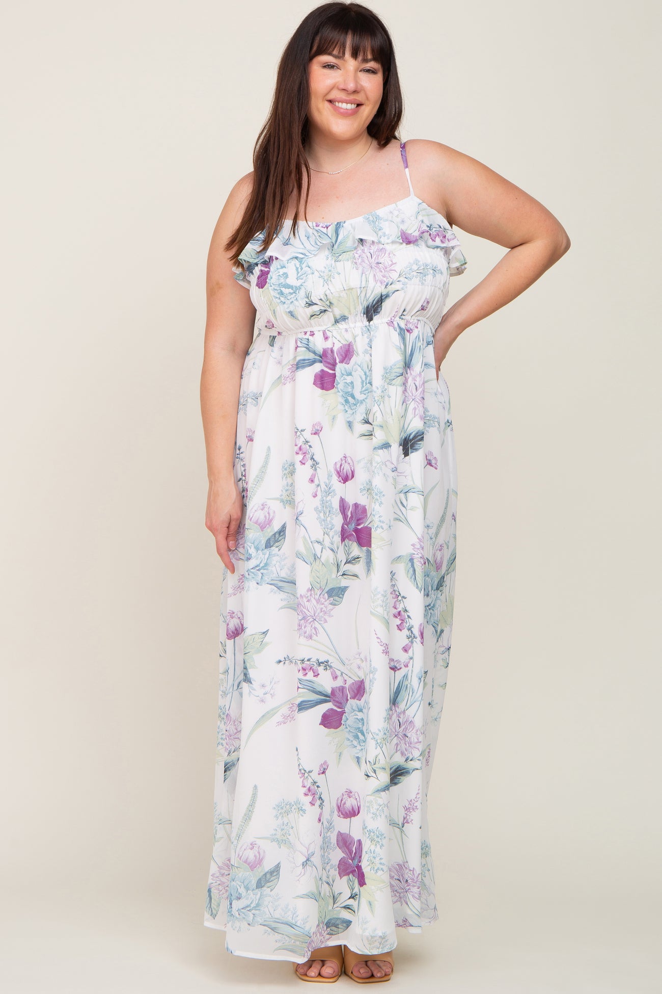 White Floral Sleeveless Ruffle Plus Maternity Maxi Dress