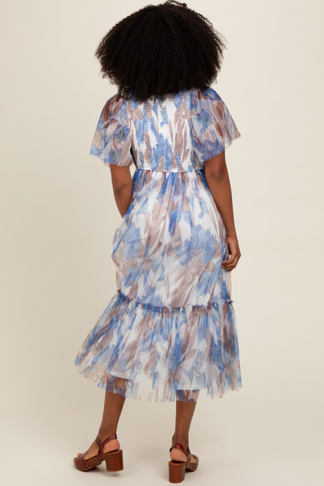 White Leaf Print Mesh Smocked Midi Dress