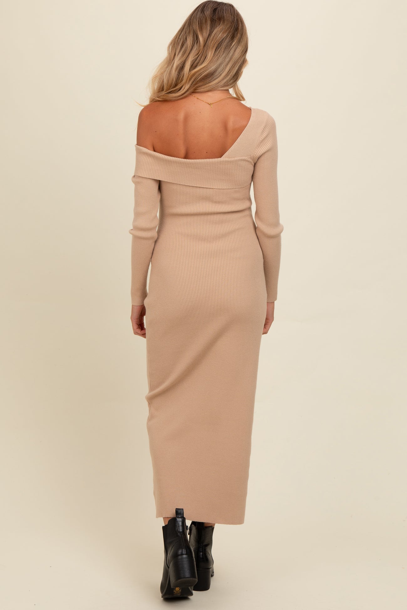 Beige Foldover One Shoulder Maternity Maxi Sweater Dress