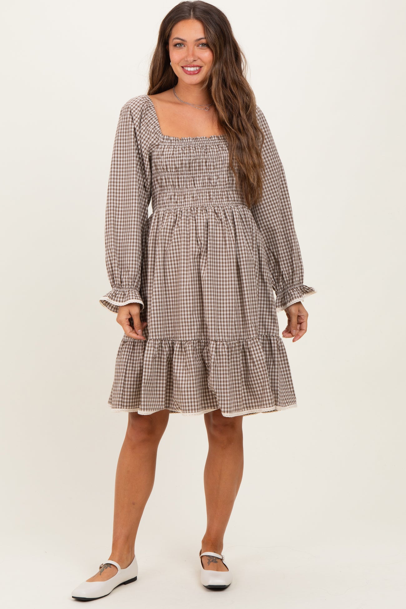 Embrace timeless elegance with this vintage-inspired checked plaid maternity dress, designed to complement your pregnancy glow. Featuring a flattering square neckline and long puff sleeves with delicate ruffled cuffs, this dress offers both style and comfort. The smocked bodice gently stretches to accommodate your growing bump, while the tiered skirt adds a playful, feminine touch. Crafted from soft, breathable fabric, it’s perfect for everyday wear or special occasions. Pair effortlessly with flats or heels for a chic, versatile look throughout your maternity journey.