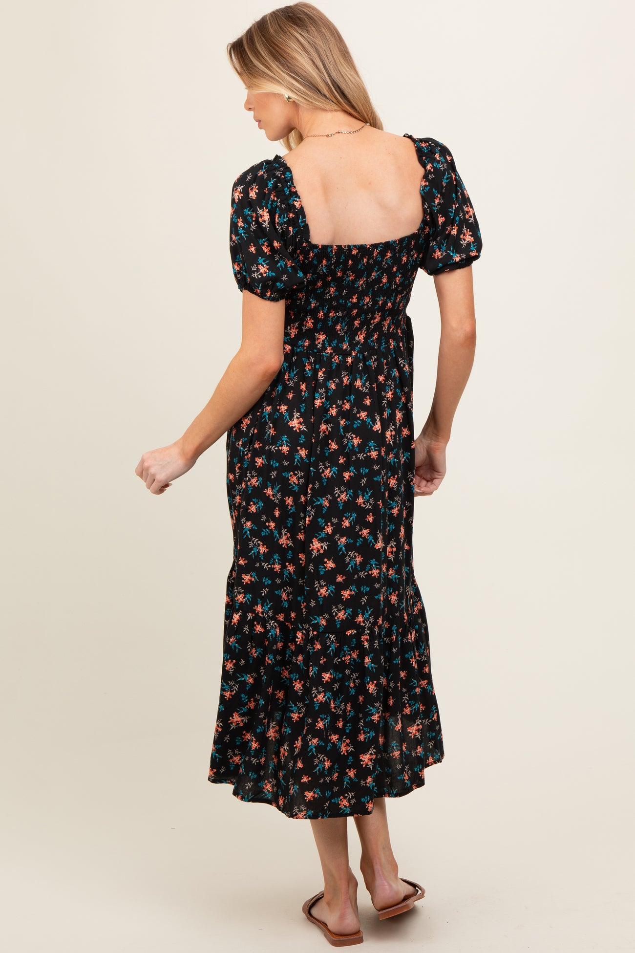 Black Floral Smocked Short Sleeve Maternity Midi Dress