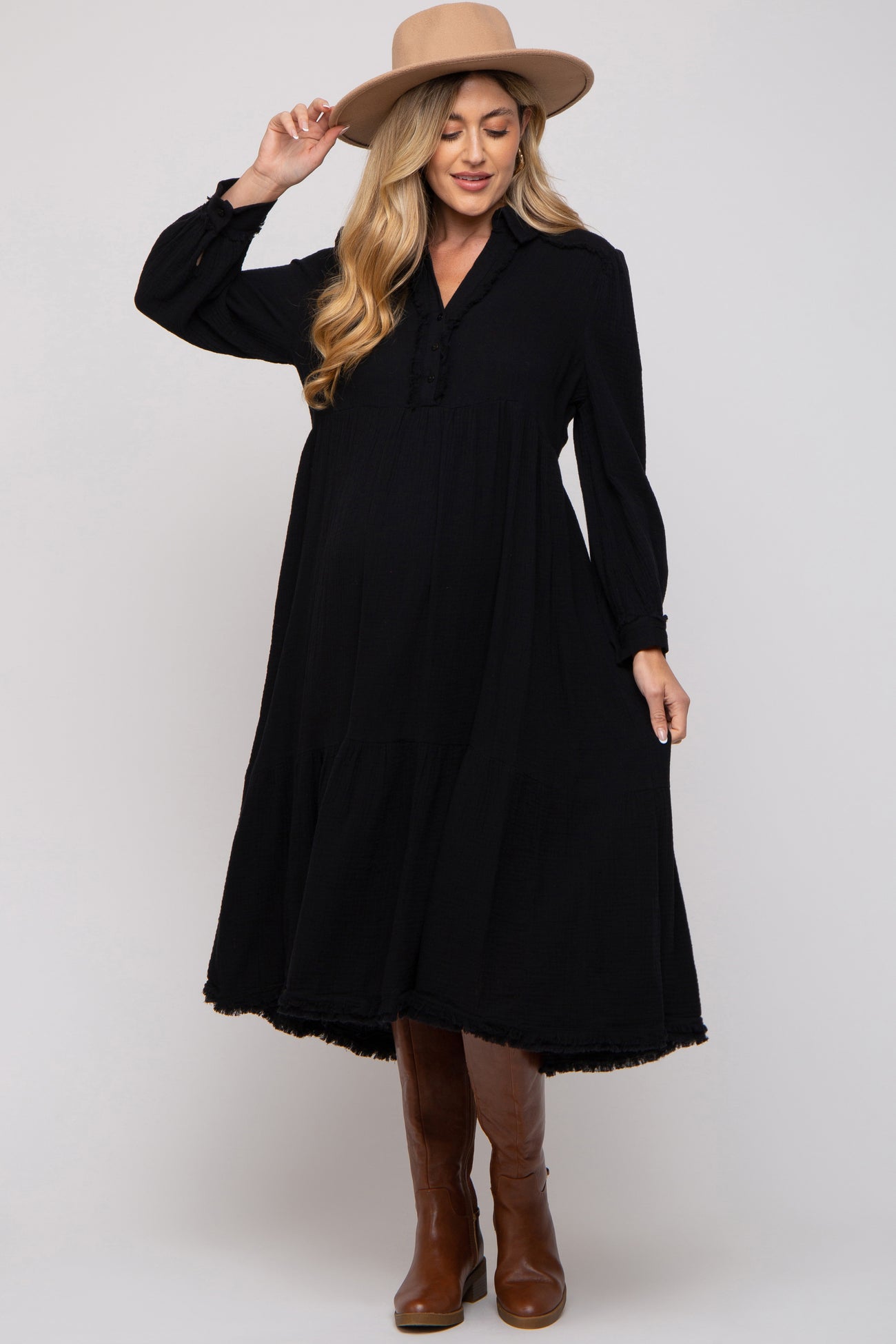 Details A solid long sleeve maternity midi dress with a collared neckline, button down detail on chest, and fringe accents. Content + Care