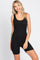 A sleeveless ribbed bodysuit. Fitted. Rounded neckline.