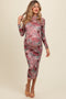 A pair of medium wash maternity denim shorts with fringe split hem detail, five pockets and a belly band. Material has medium stretch.