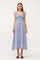 A midi dress with a ruffle accent squared neckline, smocked and ruffle straps, a smocked top, and side pockets. Dress is fully lined.