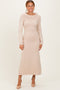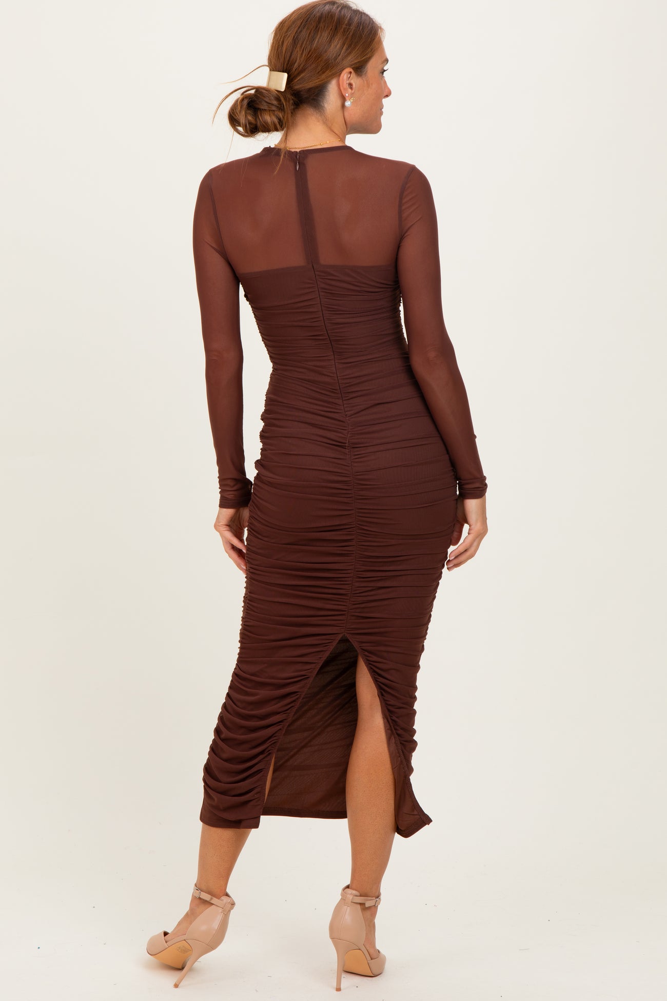 Brown Mesh Ruched Long Sleeve Midi Dress