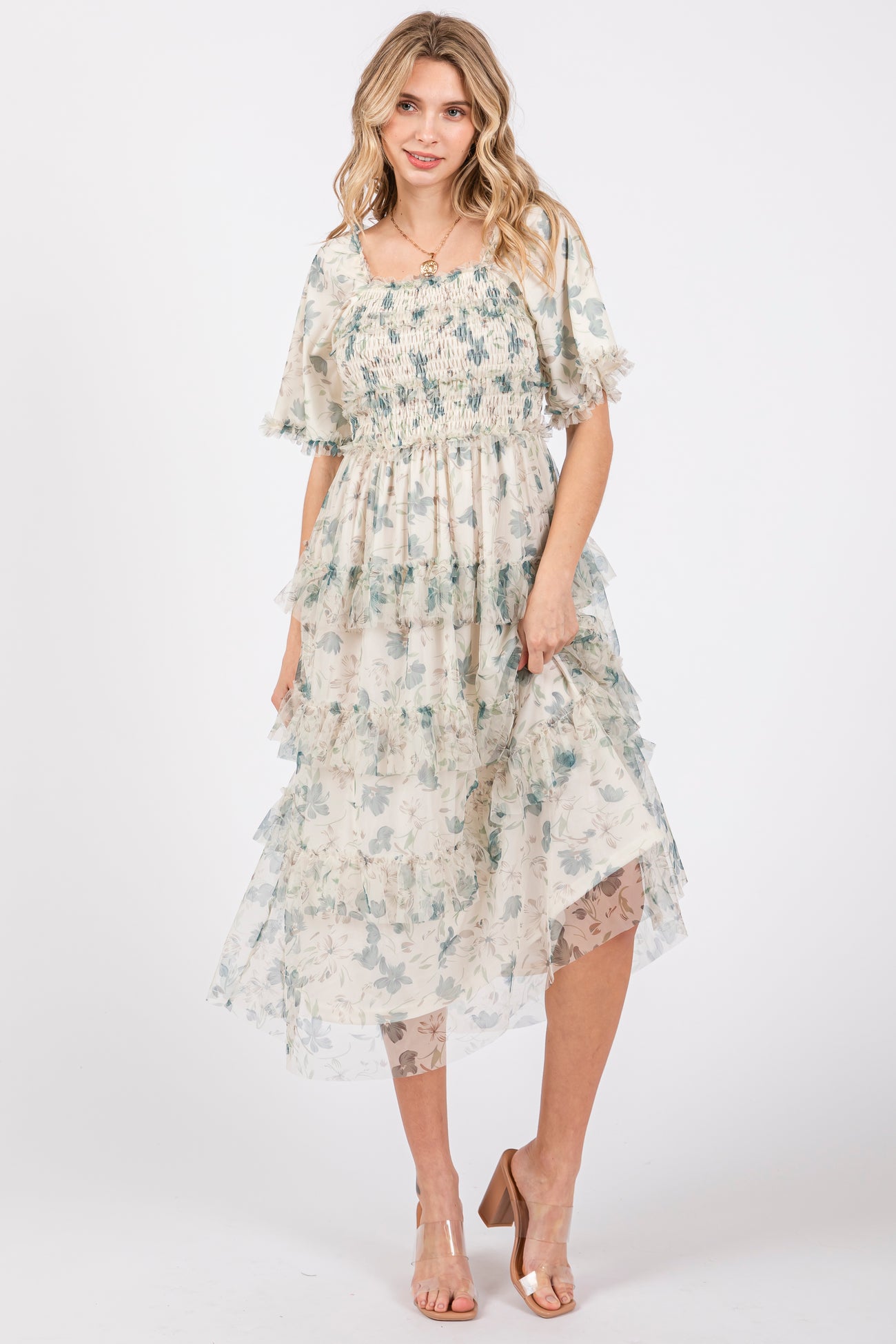 Cream Floral Tulle Smocked Ruffle Tiered Midi Dress