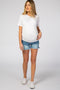 A solid hued maternity top featuring a button accent on front, a tie accent on hemline, a v-neckline, and short sleeves.