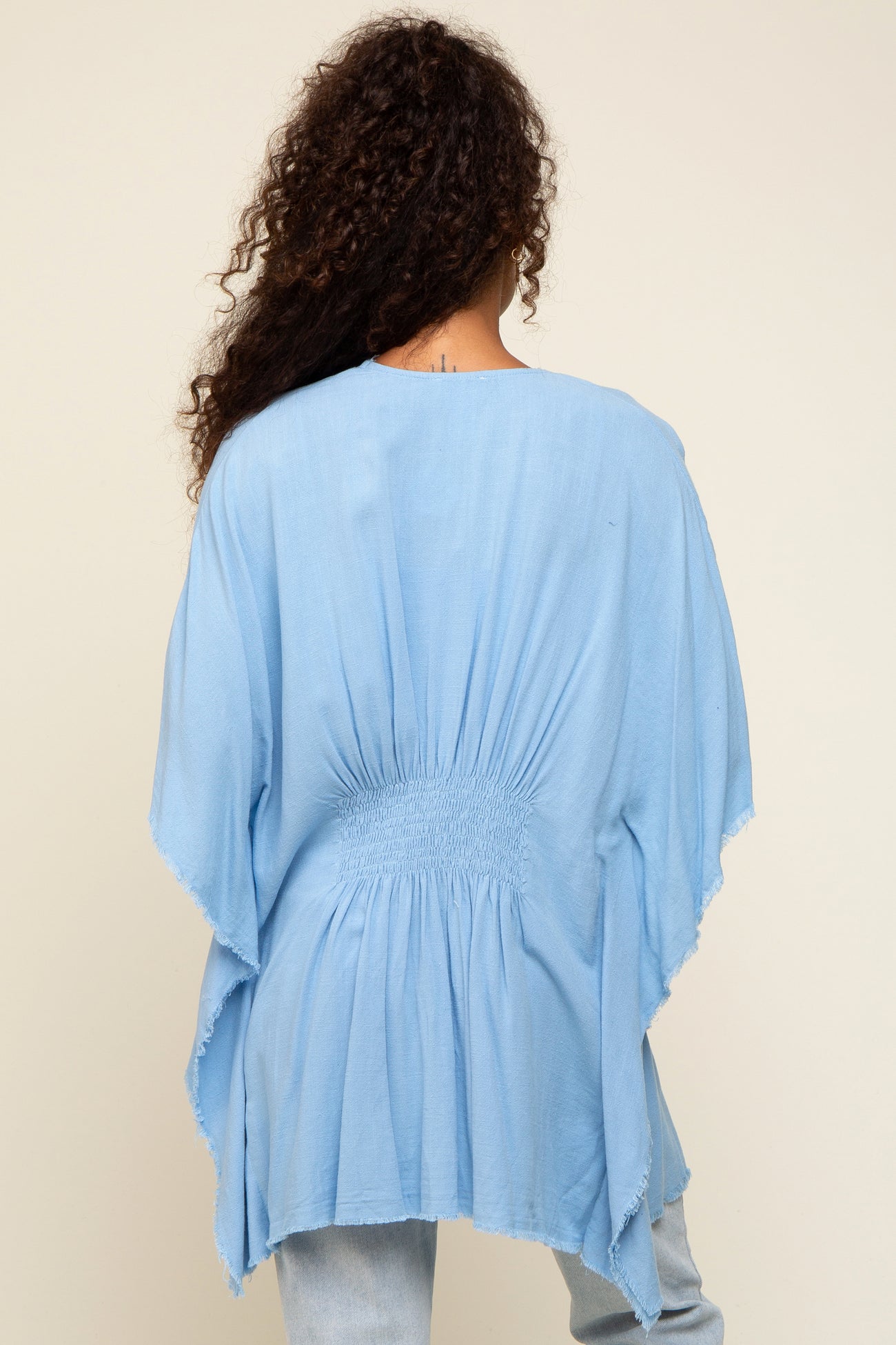 Details A solid short sleeve cover up with an open front, smocking in back and fringe detail. Content + Care