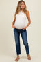 A soft knit maternity tennis romper dress. Features a scoop neckline, a racerback with a cutout, removable cups, an elastic band under the bust, and side pockets on the shorts.