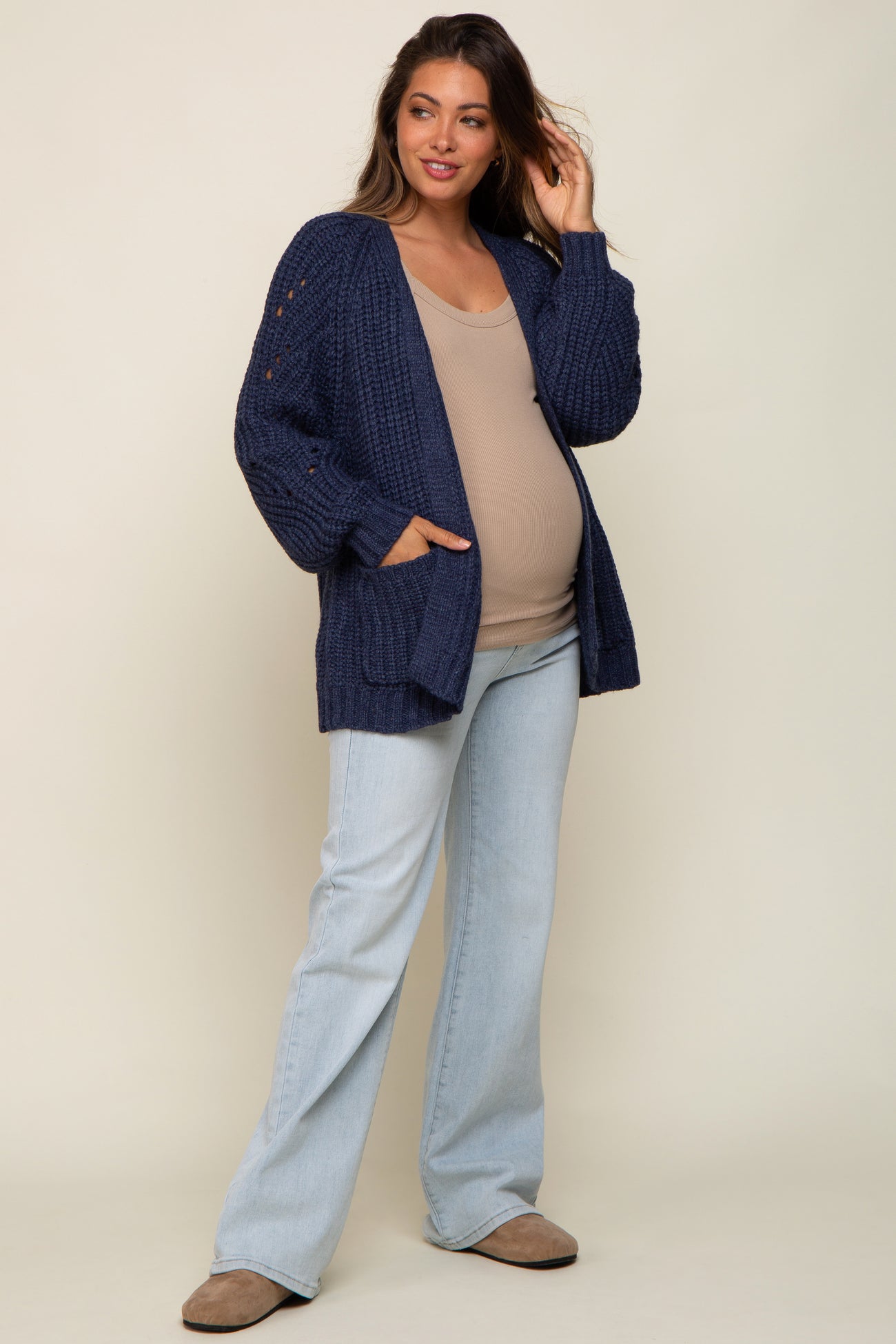 A solid long sleeve thick knit maternity cardigan with two front pockets.