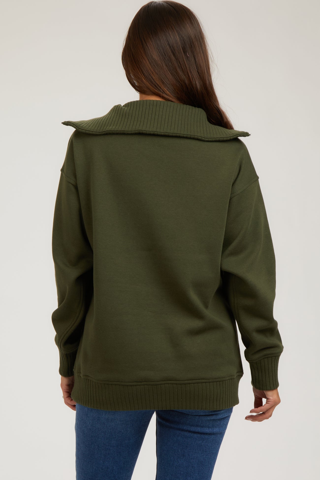 Details A solid hued maternity pullover featuring fleece lining, long sleeves and a front zipper closure. Content + Care