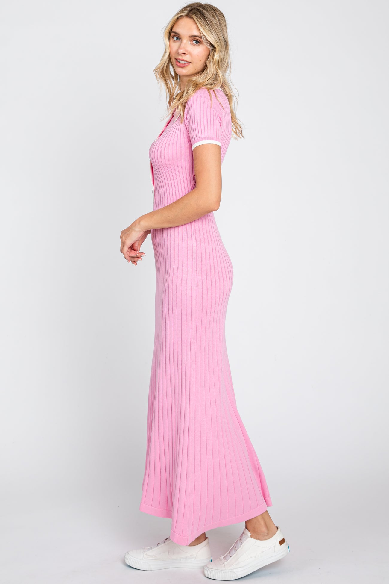 Details A solid knit midi dress with colorblock trim detail. Features collared neckline and button front detail on bust. Content + Care