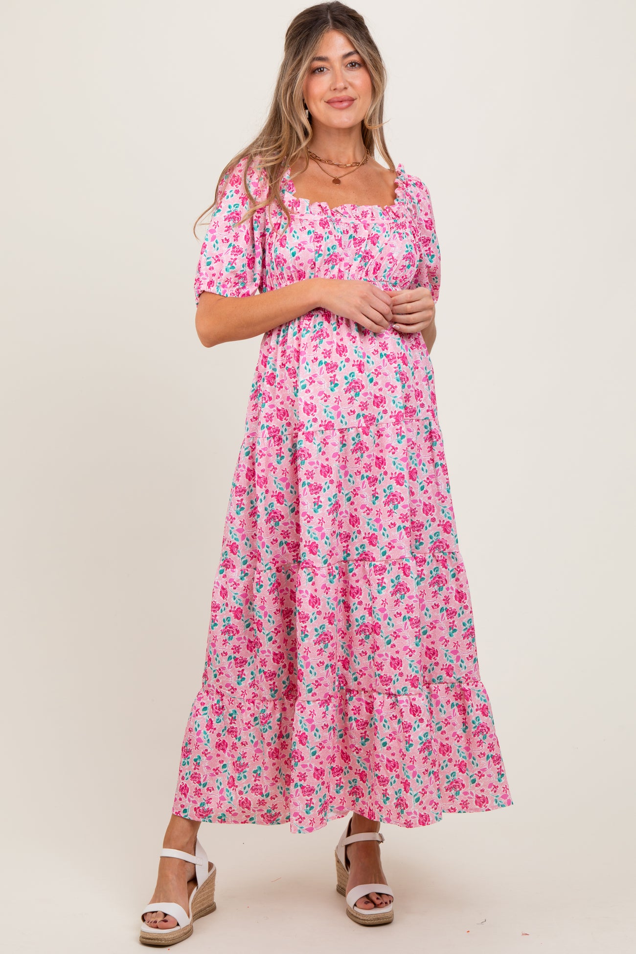Pink Rose Print Ruffle Trim Puff Sleeve Maternity Maxi Dress