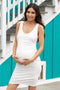 A solid hued fitted maternity dress featuring an off shoulder ruffle neckline and ruched sides.