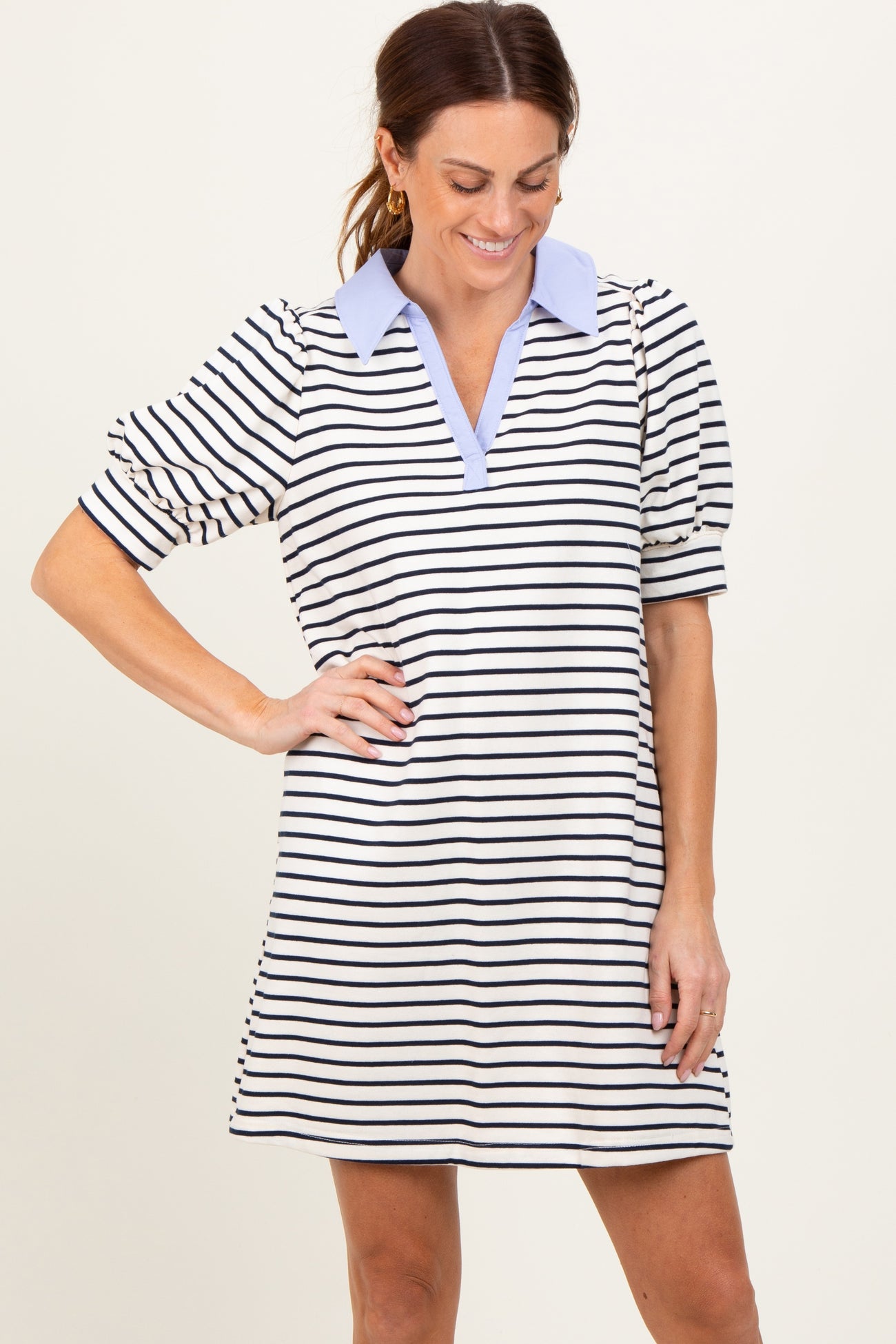 White Striped Collared Puff Sleeve Maternity Dress