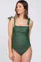 A one piece swimsuit featuring flutter sleeves, a cutout knotted front, a back cutout, a back closure and removable padding at the bust.