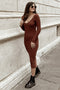 A solid hued midi dress featuring a v-neckline with an adjustable front tie, a front cutout, short ruffle sleeves, a smocked elastic back, an empire waist and an A-line double lined skirt.