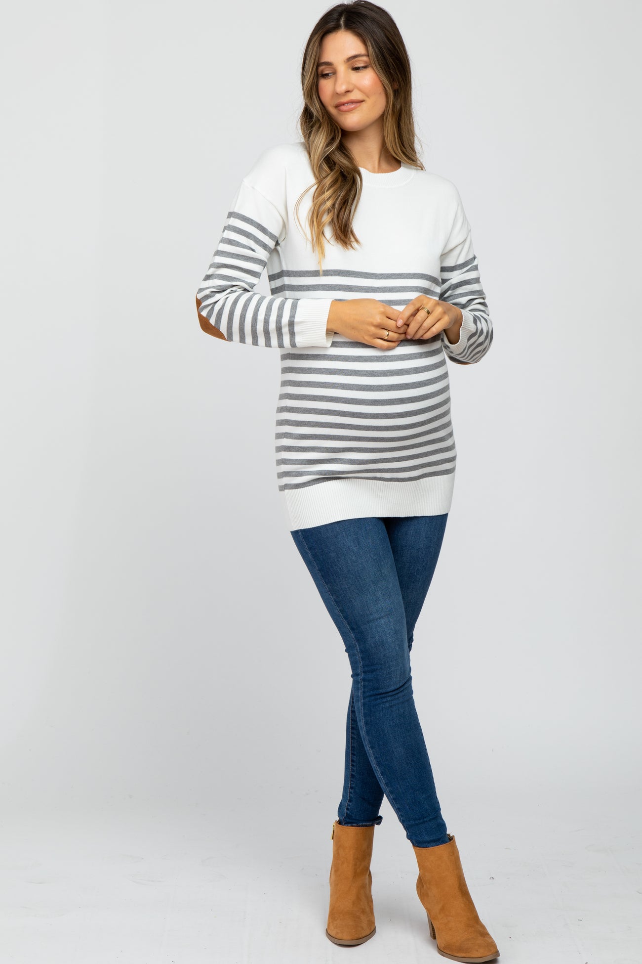 Heather Grey Striped Elbow Patch Knit Maternity Sweater